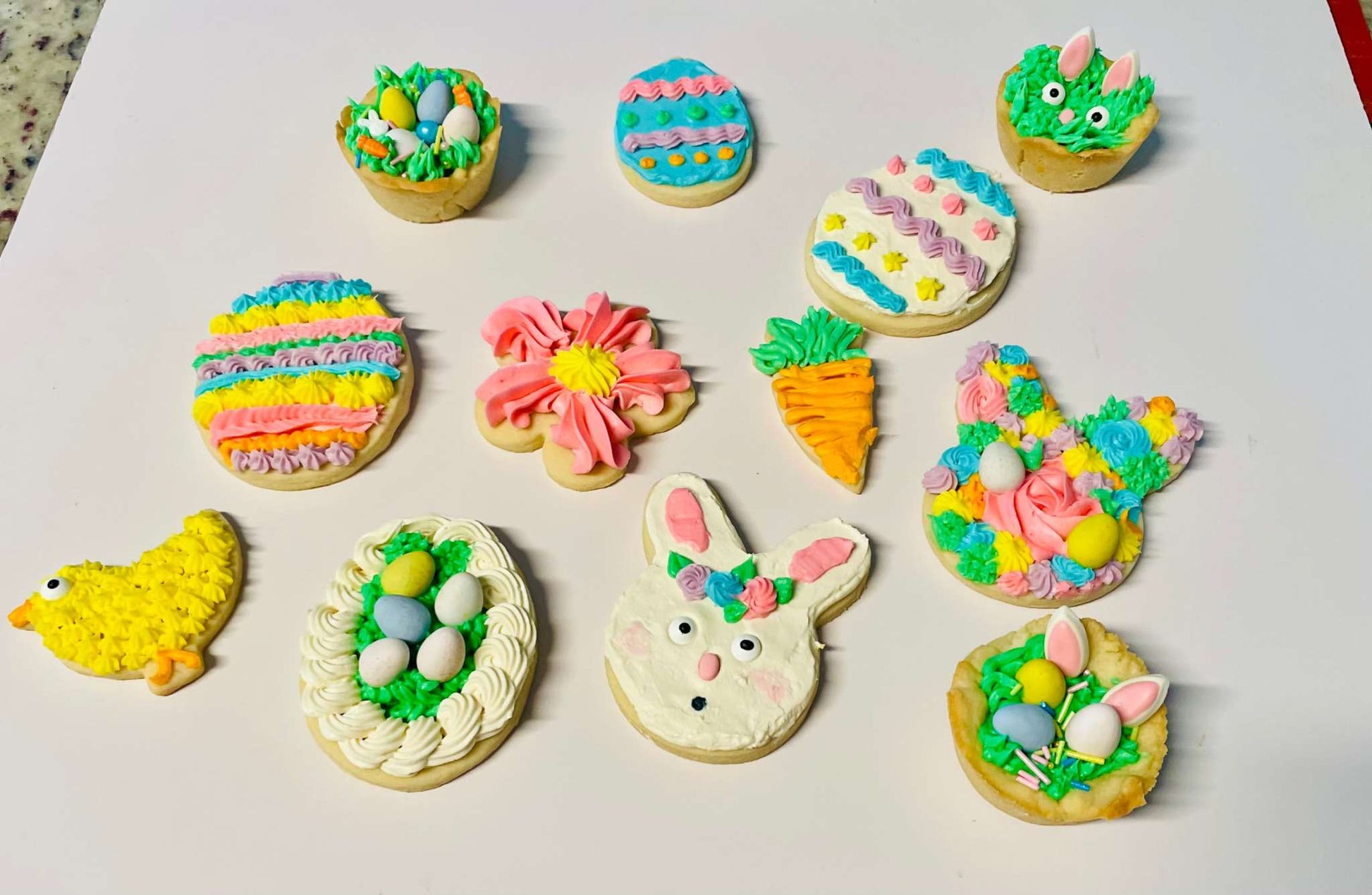 You’ll decorate one dozen sugar cookies with silky buttercream and festive Easter décor, including edible eggs, bunny feet, and spring-inspired details.